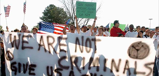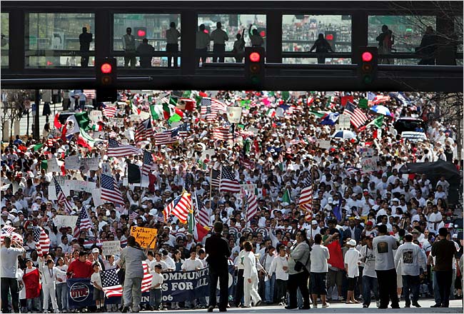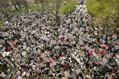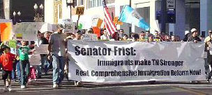 Diego, California: 50,000 Partial Listing of Monday, April 10 Protests (geographically from the south) Alabama: Albertville, 5,000; -Birmingham, 3,000 [TOP] Congress Must Face Reality Immigrants Want Equality Oakland, CA - Senators will pat themselves on the back this week, for agreeing to their most pro-corporate, anti-immigrant bill in decades. Tens of thousands of people may be forced to leave the U.S. as a result. Millions more would have to become braceros - guest workers on temporary visas - just to continue to labor in the jobs they have had for years. More workplace enforcement will result in firing thousands of others, creating a climate of fear that will make defending workplace rights and joining unions riskier than ever. And a border like an armed camp will continue costing the lives of hundreds of humble farmers and workers every year, crossing towards a shattered dream of a better life. No wonder people have been in the streets for weeks, with even bigger demonstrations and marches yet to come. These are ordinary people, not activists, coming out of working-class homes all over the country. A million in Los Angeles. Half a million in Chicago. Tens of thousands crossing the Brooklyn Bridge. Hunger strikers in San Francisco. Demonstrations in states where the immigrant community has been virtually invisible until now, like North Carolina and Tennessee. Border towns like Tucson. Cities from Santa Rosa to Omaha. Everywhere, immigrants and people who support them are condemning the draconian measures passed by the House of Representatives in December, especially the provision that would make undocumented people federal felons. The demonstrations have shamed especially the Senate's slight-of-hand, where second-class guest worker programs are called "a path to legalization," and the only way families can gain legal status for their undocumented members is to spend a decade or more working as braceros. Contrary to Senate proposals for deportations and bracero visas, people carry signs demanding amnesty. These myriad marchers - families with children and grandparents in tow - have a simple alternative. Equality. Many unions support them. Among the most outspoken are the Teamsters in Orange County, heart of the anti-immigrant offensive, where the mayor of Costa Mesa told his police department to begin picking up immigrants who lack visas. Teamsters Local 952 says people need real legal status, not a guest worker program. A recently passed resolution condemns both Congressional proposals, because they "do nothing to remove the economic incentives that unscrupulous employers have to hire and exploit immigrant workers, and fail to really address the fact that we have 11 million undocumented workers in this country contributing to our communities." The union "opposes any form of employer sanctions because they have historically resulted in 'employee sanctions' in the form of firings of workers for union organizing and discrimination practices on the job," and "opposes guest worker legislative proposals because such modern day 'bracero programs,' create an indentured servitude status for workers." The AFL-CIO says the same, pointing out that if there are jobs for 400,000 braceros a year (the goal of the Senate reform bill), those immigrants should be given 400,000 green cards, or residence visas, instead, which would guarantee them equal status in their workplaces and communities. The Senate bill, the AFL-CIO says, "tears at the heart of true reform and will drive millions of hard-working immigrants further into the shadows of American society." Instead, "we should recognize immigrant workers as full members of society - as permanent residents with full rights and full mobility that employers may not exploit." When Senator John McCain, co-sponsor of the Senate's main guest worker plan, tried to defend it to a building trades union audience in his home state this week, he was booed. He told the construction workers that even at $50 an hour they would not be willing to pick lettuce, implying that only Mexicans were willing to do farm labor. For some in the audience, McCain's remarks recalled former California Senator George Murphy, who infamously declared in the 1960s that only Mexicans would perform stoop labor because "they're built so close to the ground." Needless to say, McCain did not actually include in his bill any wage guarantee for guestworkers, much less $50/hour (about 5 times what lettuce cutters make today). A concerted effort by some lobbyists is underway in Washington, however, to convince legislators that guest worker status, while unpleasant, is something immigrants themselves are prepared to accept. But outside the beltway their proposal is meeting a rising tide of rejection. In New York City, Desis Rising Up & Moving and 20 other grassroots groups formed Immigrant Communities In Action, and condemned both House and Senate bills for not halting the wave of detentions and deportations visited on Muslim communities since 9/11. Another coalition, which includes the National Mobilization Against Sweatshops, the Chinese Staff and Workers' Association, and the Asian American Legal Defense and Education Fund, also rejects guestworker programs. Like the Teamsters, these groups say Congress should abolish employer sanctions instead, since they are often used to retaliate against undocumented workers who demand labor rights. The National Network for Immigrant and Refugee Rights criticizes both the Senate and House bills because they hold "no promise of fairness in immigration policy and would undermine the rights, economic health and safety of all immigrants and their children. Congress needs to go back to the drawing board to come up with genuine, positive and fair proposals." Are there any such proposals before Congress? Yes, although beltway advocates have tried to smother the most progressive of those alternatives with silence. A year ago Congresswoman Sheila Jackson Lee and Co