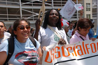People’s Freedom Caravan Mobilizes for Social Forum The Peoples’ Freedom Caravan, organized by the Southwest Workers Union, stopped in 7 cities across the southern United States as part of organizing for the U.S. Social Forum in Atlanta. At the various stops it worked to support numerous community struggles for human rights and justice. The Freedom Caravan started in Albuquerque, New Mexico. Its stop in San Antonio, Texas, was representative. Participants in the caravan marched in solidarity with the local movement for immigrant and workers rights. Stopping at the office of Senator John Cornyn, marchers, including international delegates, called on Congress to provide just immigration reform that legalizes all, keeps families united, protects worker rights, supports a living wage and creates a friendly demilitarized border region. Participants demanded that the funds currently building walls and imprisoning families instead fund sustainable reconstruction of the Gulf Coast, a focus of the Caravan. A delegation continued on to Tyler, Texas to protest the inhuman Hutto prison camp and demand freedom for the detained women and children. The San Antonio community joined in sharing their history, culture and struggles. Local representatives, including many youth, joined the caravan for the rest of the trip through the south and the convergence at the U.S. Social Forum. Participants discussed proactive ways to address the problems of poverty, globalization, environmental contamination and racism. Rejecting a democracy that prevents access to the decisions that affect the lives of workers and national minorities, the caravan mobilized to unite people across racial, cultural, geographic and language barriers and to organize for rights-based solutions. The participants brought out that it is part of efforts to empower people to create the social change necessary to bring about another U.S. For more information: [TOP]