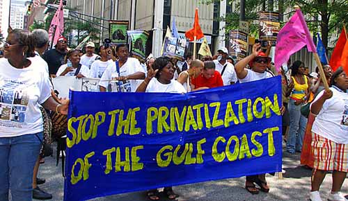 Katrina Organizers at USSF Build Gulf Coast Self-Determination and Reconstruction Movement Organizers defending rights of Katrina survivors and New Orleans and Gulf Coast workers and residents played an active role at the U.S. Social Forum in Atlanta. Below we reprint content from the People’s Hurricane Relief Coalition on some of the problems addressed in the workshops presented (see peopleshurricane.org) They Left Us Here to Die: This presentation exposed the systematic program of ethnic cleansing taking place in New Orleans and the Mississippi Gulf Coast. The Black majority of the regions, particularly in New Orleans, are being denied the human right to return to their homes by the government on all levels. Rather than adhering to the human rights standards and international treaties that govern the process of relief, resettlement, and reconstruction for Internally Displaced Persons (IDPs), or its own laws and policies, such as the Stafford Act or the “USAID Assistance to Internally Displaced Persons Policy,” the U.S. government has fundamentally chosen a neo-liberal, free-market solution to guide its policy of recovery, resettlement, and reconstruction in New Orleans and the Gulf Coast. We Are Our Own Liberators: This workshop focused on the struggle of oppressed peoples in the Gulf Coast to rebuild their own communities, fight for the right of return, and confront racism and human rights violations of the United States government. It will focus specifically on the International Tribunal on Hurricanes Katrina and Rita that is seeking to charge the U.S. government with numerous crimes against humanity, particularly against Black communities, committed before, during and after the Hurricanes. The Tribunal will be held in New Orleans August 29 – September 2, 2007. Stop the High Rent: This workshop focused on one concrete aspect of the struggle for the right to return that is taking place in New Orleans currently. The workshop presented the work of the Tenants Rights Working Group of the Peoples Hurricane Relief fund and explored the issue of rental price-gouging in New Orleans following the government organized disaster after Katrina. You Can’t Kill the Spirit: “You Can’t Kill the Spirit” brought together leaders from organizations based in and outside New Orleans to share reflections and lessons on how social justice activists from around the country are supporting the struggle for New Orleans and building grassroots power. The panel explored goals and strategies of New Orleans based groups and those nationwide as they work to strengthen their unity and consciousness to advance the struggle for rights. Say What? A Dramatic Reading & Discussion of Government Lies Against the backdrop of a video display of the inhumane treatment of Gulf Coast residents during and after Hurricanes Katrina and Rita, this session began with a spoken word piece that introduced the human rights abuses perpetrated by the U.S. government in its efforts to privatize communities and public services in the Gulf region. Following the spoken word, a dramatic reading exposed the audience to the lies told by the government in little known reports about human rights and the Gulf Coast reconstruction. The government has submitted these reports to United Nations’ officials, who monitor the federal government’s compliance with treaties that protect the human rights to life, non-discrimination, and racial equality. The dramatic reading presented the outrageous statements made by the government, which ignore human rights protections for Gulf Coast residents struggling to return, rebuild, and recover. People from the Gulf Coast, whose human rights continue to be violated, presented their responses to each statement by the government. These responses highlighted the interrelationship of the many struggles for justice, including the right of return, racial justice, workers’ rights, immigrant and migrant rights, environmental justice, children’s rights and quality public education, anti-violence, voting rights, reform of the prison system, community self-determination, and economic justice. The Future of the Black Liberation Movement: A conversation initiated by the People’s Hurricane Relief Fund, Black Workers for Justice, and the Labor/Community Strategy Center. The panel was aimed at engaging a constructive discussion to advance a movement for Black self-determination and a multi-racial Reconstruction movement, centered on strengthening the on-the-ground struggles in the Gulf Coast—and major urban centers of resistance throughout the U.S. This conversation served to situate the struggle for Black self-determination in an anti-imperialist and internationalist perspective. It addressed efforts to build a Reconstruction Movement, the tactics and demands needed to unite forces throughout the Gulf Coast and throughout the U.S. The workshop utilized the experience of on-the-ground social movements that are the foundation of African American self-determination—including the struggle of Black women, workers, prisoners, all oppressed nationality communities, and demands for environmental justice and Black political power.