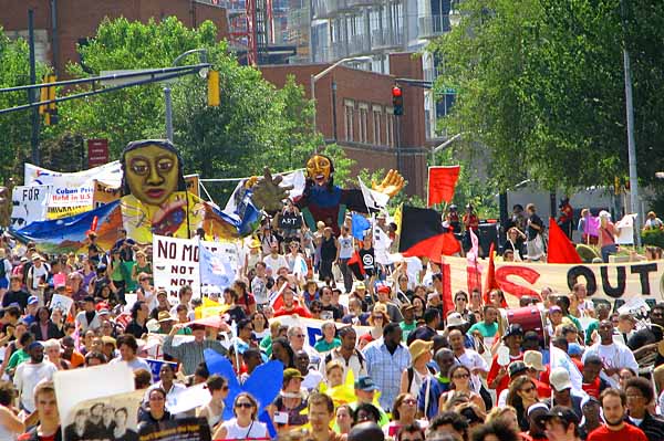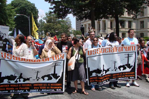 U.S. Social Forum: Another World is Possible Another U.S. Is Necessary! The U.S. Social Forum was successfully organized in Atlanta from June 27-July 1. It brought together a broad range of organizations that included collectives representing the many faces of the American people: Native Americans, Mexicans, Arabs, Asians and immigrants from all lands, African Americans, workers, women, youth and seniors, all united in demanding that Another World is Possible and Another U.S. is Necessary! A main highlight of the event was the opening march through downtown Atlanta, where an estimated 10,000 marched and rallied. Banners, signs, dance and music showed the militant spirit of all to fight for rights and together win change in the U.S. The Forum also emphasized the stand to oppose U.S. chauvinism and stand as one with the peoples of the world against U.S. imperialist aggression. Whether speaking of defending the rights of Native Americans, Katrina survivors or immigrants, or the rights of the peoples of Iraq and Palestine, the demonstration and forum stood firm with the resistance of all. A main focus of activities was organizing work targeted at the government and building organization among the people. Six main themes were addressed through nearly 1000 workshops and plenary sessions. These themes included: Gulf Coast Reconstruction in the Post-Katrina Era; War, Militarism and the Prison Industrial Complex; Indigenous Voices: From the Heart of Mother Earth; Immigrant Rights; Workers’ Rights in the Global Economy, Liberating Gender and Sexuality: Integrating Gender and Sexual Justice Across Our Movements. The interconnected character of these issues and the crises of U.S.-style democracy with its genocide, repression and empire building were brought out in the many activities. Workshops, presentations, performances, debates and plenary sessions all contributed to providing a space for exchanging experience and making links. Various collectives also organized caucuses to bring together organizers focused on issues such as immigration. Various groups organized buses and caravans to the Social Forum. Three busloads of Katrina survivors and organizers from New Orleans joined the march, bringing their dancing and drumming with them. The Freedom Caravan, with eight buses and thirteen vans also marched. The Caravan left from Albuquerque, New Mexico and traveled through 7 cities on the way to Atlanta, building ties and adding people as it addressed immigrant rights, defending Native peoples and environmental issues. Hundreds of anti-war activists and groups also participated, including many vets and military families. A resolution denouncing the war crimes of Bush and Cheney and calling for their impeachment was among the many resolutions passed. Native peoples were present in force, as main speakers and organizers of workshops. Representatives from the Eastern Band of Cherokee Indians welcomed everyone. Representatives from the Western Shoshone, as well as those from Hawai’i and Alaska also participated. All spoke to the genocide against Natives and to their unvanquished spirit and stand in defense of their rights and the rights of all and of Mother Earth. They, like representatives from all the many collectives emphasized, that “It will take all of us standing together,” to bring the change necessary. It was in this spirit of strengthening common work and together building another world that the Forum concluded.
