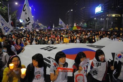 Just over 100 days after he took office, President Lee Myung Bak of south Korea is facing the collapse of his government. Massive protests by south Koreans are demanding his resignation and rejecting his stand to submit to U.S. dictate. This includes U.S. efforts to impose a “free trade agreement” that will greatly harm Korean agriculture and self-sufficiency while increasing U.S. domination. Since coming to office, Lee has also submitted to U.S. demands to stop reunification efforts, a demand widely opposed by demonstrators. During the last two weeks, in several cities, hundreds of thousands of people have taken to the streets in protest. A main target is Lee’s decision, demanded by the U.S., to lift the ban against U.S. beef. The ban was imposed in 2003 due to a threat of mad-cow disease from the U.S. Before that, south Korea was the third largest export market for U.S. beef, with $800 million in sales. The Koreans are resolutely opposing this and all the actions of Lee. Since taking office on April 25, 2008, the pro-U.S. Lee has consistently gone against the interests and demands of the Korean people. A main example has been his utter disregard for the June 15 North-South Joint Declaration and the October 4 Agreement between the DPRK and the Republic of Korea (ROK). He also tried to collapse the Unification Ministry, which looks after inter-Korean affairs. He wanted to eliminate it and have just an office in the Ministry of Foreign Affairs. Lee even tried to suggest that the 10 preceding years of inter-Korean cooperation and relationship building were “lost years.” He would instead take a “pragmatic approach” and “review” the relationship and agreements between north and south. In the face of the demand that U.S. troops must leave Korea immediately, the Lee Myung Bak regime has worked with the Bush administration to consolidate and extend the presence of U.S. troops in south Korea under the pretext of forging a “21st century strategic partnership with the U.S.” Lee has also tried to implement English as the medium of instruction in south Korean schools claiming that English is the international language. This proposal was met with opposition throughout south Korea. At this point, Lee is the most unpopular president in the history of modern south Korea. Hundreds of thousands of south Korean workers, teachers, youth, women, religious groups and others have joined the protest to oust the Lee Myung Bak government. Confronted by these massive protests, the south Korean government has called out tens of thousands of riot police to suppress the demonstrators. Water cannons and truncheons have been used against the protesters, but this state violence has only made the people more determined to get rid of the regime. On June 10, Prime Minister Han Sung Su, Presidential Chief of Staff Ryu U Ik, the minister of Agriculture, Forestry, Fisheries and Foodstuff, the minister of Health, Welfare and Families, the minister of Education, Science and Technology, the minister of Planning and Finance and all other ministers officially offered to resign. The struggle to defeat Lee’s pro-U.S. government, which has worked against the movement for reunification and against the interests of the Korean people is an expression of the political unity and consciousness of the Korean people. It is serving notice that the Korean people will not submit to U.S. policies and dictate. In their hundreds of thousands, the people of south Korea are representing the drive for reunification and are contributing to the struggle for peace. [TOP] Candlelight Protests in South Korea Grow Broader Candlelight protests in south Korea against U.S. beef imports are growing even broader. An “event on the eve of the one million people candlelight demonstration” was staged in Seoul on June 9 with more than 10,000 people from all walks of life involved. A candlelight rally was held in the plaza of the City Office on the theme “Let us punish the Lee Myung Bak regime through the one million people candlelight demonstration on June 10!” The participants in the rally held a memorial service for Ri Pyong Ryol, a member of the group Solidarity with the Struggle for Impeachment of Lee Myung Bak, who committed self-immolation in protest against the traitor Lee’s opening of the Korean market to U.S. beef. At the end of the rally its participants staged a demonstration. Then they gathered again in the plaza of the City Office to hold colorful events including the people’s grand forum. That day the organization Solidarity for Implementing the South-North Joint Declaration, the Confederation of Trade Unions, the Federation of Trade Unions and the Democratic Labor Party in south Korea separately issued statements expressing their support for the one million people candlelight demonstration. The Federation of Peasants’ Associations called a press conference where it declared it would take part in the candlelight action on June 10 and, at the same time, hold simultaneous candlelight rallies in 63 regions of south Korea, including Seoul. Elder Christians of south Korea also called a press conference and issued an emergency declaration to express their plans to participate in the June 10 action. Ri Sung Ho, chairman of the south Korean Council of Youth Organizations, made public an “appeal on the occasion of the one million people candlelight demonstration on June 10.” The Teachers Union of south Korea held a meeting and also issued a statement, affirming that 90,000 unionists and 400,000 teachers would join in the demonstration. On the same day, the Federation of Government Employees’ Unions, the Court Employees’ Union, the Solidarity of Employees of Autonomous Organizations of Large Cities, the Teachers Union, the Trade Union of Government Employees for Democracy in south Korea jointly issued a public statement of government employees and teachers on the struggle to restore the right to quarantine and defend