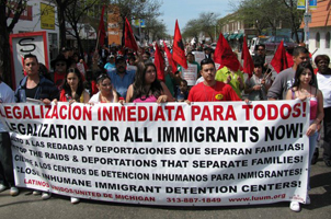 Salute to Demonstrators March 20 & 21 Defend the Rights of All Abroad and at Home! The U.S. Marxist-Leninist Organization salutes all those joining to ensure the success of the mass actions taking place March 20 and 21. Anti-war and immigrant rights organizers from across the country are engaging many thousands of people in standing against militarization and all U.S. wars and repression. Youth are in the forefront, demonstrating that they will fight the rich, not their wars! Many organized forces are coming together to strengthen their unity in action and in the course of this build their working relations and ability to further build the organized resistance. The March 20 dmeonstration is demanding All U.S. Troops Home Now! End All U.S. Wars and Occupations! On March 21 the demands are for immigrant rights — to End the Raids and Deportations! Legalization Now! Reform legislation that meets these demands is required. The demonstrations taking place give expression to the determined stand of the peoples that An Injury to One is an Injury to All. This holds true whether that injury is taking place against the peoples of Iraq and Afghanistan, or it is directed at immigrant families and communities here at home. The peoples here and abroad are saying NO! to aggresive wars and NO! to attacks on rights. The government’s border death wall, detention camps and mass deportations of more than 387,000 immigrants without cause in just the past year — 120,000 more than Bush in his last year in office — are an integral part of the militarization of the country. Obama’s massive war budget is coupled with an increasedbudget for the Department of Homeland Security (DHS) of $56.3 billion. It includes $4.6 billion for 20,000 more Border Patrol agents and for completing another section of the border death wall in Arizona. The DHS is also dedicating $1.6 billion for enforcement of the hated DHS programs, like CAP, responsible for mass detention and deportations. We applaud all those rising in resistance, in DC, in Palestine, in Iraq, Afghanistan, Haiti, around the world. This growing resistance shows that the imperialists are failing in their efforts to terrorize all into silence and submission. It is resistance that is the path to peace. It is strengthening organized resistance in the course of fighting for the rights of all that is the path to progress and a bright future. Voice of Revolution urges all participants to build on the fighting spirit expressed in these actions and to work toward increasing the unity of all the organized forces. This can be done: 1) Through joining together for united May Day actions. These are being organized in cities nationwide. Let us go all out to work together for May Day! 2) Through giving consideration to developing a slate of anti-war candidates for the 2010 and 2012 elections. We need an anti-war government that stands against all aggression and brings All U.S. Troops Home Now! We need an anti-war government that acts to End the Occupation of Palestine and End U.S. Funding for Israel. We need an anti-war government that stands for Nuclear Disarmament Now and respects the sovereignty of all countries big and small. We need an anti-war government that Stops the Raids and Deportations Now and provides Legalization Now! We need an anti-war government that defends the rights of all by acting to Stop War Funding! Stop Paying the Rich! Increase Funding for Social Programs! Building such an anti-war government is up to all of us together, as we, the organized forces, are the only ones we can rely on! All Out for May Day 2010!