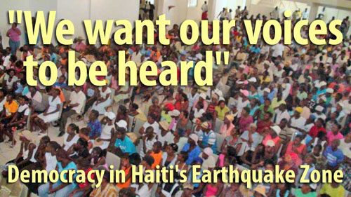 On Monday, May 17, thousands of demonstrators filled the streets of Port-au-Prince to demand their right to decide the future of the country and demand the resignation of President René Préval for violating the 1987 Constitution. They opposed the “state of emergency law” passed which extends Préval’s term and submits Haiti to foreign domination, primarily by the U.S. Protesters also again demanded that democratically-elected President Jean-Bertrand Aristide be allowed back into the country. He was forced into exile by a U.S.-organized coup d’etat in 2004. The U.S. insists that Aristide not return and Préval submits, just as he has submitted to foreign domination. Demonstrators are also opposing the rigging of elections taking place, in part through blocking participation of the Fanmi Lavalas party of Aristide. The May 17 demonstrators stepped off from St. Jean Bosco, Aristide’s former parish, marched down Grande Rue, took Rue St. Martin up to Belair, then came down Rue Montalais to rally in front of the National Palace. All along the march, demonstrators held up posters and banners calling for Préval’s resignation and for a passport or laisser-passer for President Aristide to return to Haiti. “The emergency is not an emergency,” demonstrators chanted, rejecting the use of their difficult conditions as an excuse for foreign enslavement. The demonstrator made several laps around the Champ de Mars, the capital’s central square, despite the metal barriers police had erected. In confrontations between the demonstrators and the police’s Company for Intervention and the Maintenance of Order (CIMO), a crowd control unit, the barriers were swept aside. René Civil, one of the founders of the Heads Together of Popular Organizations (Tèt Kole) coalition which is one organization spearheading the protests, said that “All of society should enter into the struggle being waged, a struggle for a new electoral council, for everybody to participate in the anticipated elections, the struggle to get people out of tents, to give them food and healthcare, to put them in decent provisional housing. It is everybody’s battle to denounce the emergency law, to fight for young people to go to school, to college, to find work. That is why people are mobilizing today, it is a sentiment which is sweeping the country…” On May 10 outside the ruins of the National Palace in Port-au-Prince, protesters also denounced the inaction of President René Préval in response to the January 12 earthquake and demanded his immediate resignation and Aristide’s return. The protest, called by nearly 40 political parties and other opposition groups, was met with trucks filled with riot police who fired tear gas, while a U.S. Army helicopter circled overhead. Haiti was scheduled to hold presidential elections before February 2011. However, also on May 10, a quorum of the 29-member Senate voted to extend Préval’s term up to 96 days due to the emergency situation in the country. The 99-seat lower chamber approved the measure the week before. Those who oppose the extension say the extension or any delay in the vote is unconstitutional. It should be noted that since the 2004 coup which ousted democratically elected President Jean-Bertrand Aristide, supporters of Aristide and his party Fanmi Lavalas, have been blocked through bureaucratic or even violent means from participating in elections. A May 10 news report from the Al Jazeera underscores the serious problem the Haitian people are confronting, namely, being blocked from exercising control over their destiny by those who would have them as a subject people: “[As of midnight on May 10, t]he entire lower house and one-third of the senate are no longer sitting because the earthquake prevented February’s legislative elections from taking place. ‘Effectively the parliament is ceasing to exist as a governing body and the people on the streets are pretty concerned about that,’ Al Jazeera’s Seb Walker, reporting from Port-au-Prince, said. ‘It concentrates power in the hands of the president and the international commission that has been set up with former U.S. president Bill Clinton as a co-chair. ‘The people say that this means the day-to-day running of the country is now out of their hands.’” The commission, which also includes Haitian Prime Minister Jean-Max Bellerive, will oversee $9.9 billion in foreign reconstruction money pledged at an international donors conference at the end of March. This amount is 40 percent larger than Haiti’s entire gross domestic product. Many of the protesters said Préval has sold the country to foreign powers, while the commission violates Haiti’s sovereignty. “Préval should leave power and he should be arrested,” Maxime Geffrard, one of the demonstrators, shouted. “He is a traitor because he wants to sell the country to foreigners.” Demonstrations have been continuing. (Press TV, Al Jazeera, Associated Press, TML Daily) [TOP] Democracy in Haiti’s Earthquake Zone: “We Want Our Voices to Be Heard” “ We are living in the mud. We are wet and we are hungry. Those in charge have left us without hope. If they have a plan we do not know it. We are asking about the future. And we want our voices to be heard, “ Suzette Janvier a resident of St. Martin (a neighborhood of central Port-au-Prince) Each Saturday for the past two months a thousand or more Haitian earthquake survivors have met in the auditorium of the Aristide Foundation for Democracy to talk about the future of their country. Since its founding in 1996 the Aristide Foundation, whose auditorium seats up to 3000 people, has provided a place for grassroots activists and ordinary Haitians to come together to debate and discuss national issues. In response to the earthquake the Foundation is sponsoring weekly public forums in which participants tell their stories, talk about the conditions of their lives, and describe their needs; they