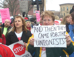 Walker signed the bill following passage in the Senate on Wednesday March 9, and then the Assembly on March 10. In all it took only three days for debate and votes in both houses in the amended bill, which removed any content on financial matters, despite being called a “budget” bill. As people have been saying from the start, this is bill is not meant to solve budget problems, especially those concerning education, healthcare and social programs. It is an anti-worker, anti-social bill that solves no problem and serves to make conditions worse. The workers and students had prepared for possible passage of the bill March 9. Many packed the gallery inside while many more rallied outside. Workers statewide were again bussed in by the unions. When the Senate passed the bill, the crowds inside erupted with shouts of Shame, Shame! As soon as word reached protesters outside, thousands stormed the Capitol chanting Whose House? Our House! and This is What Democracy Looks Like! They immediately filled the building once again, jamming three floors. Firefighters remain a main force alongside teachers, students and healthcare workers. Thousands continue to remain inside the building and local police and the county sheriff are so far not forcing them out. As the county sheriff has said, “I refuse to be the palace guard for the Governor.” State troopers have acted to remove some of those conducting the sit-ins from in front of the Assembly, but not from the building itself. March 12 is sure to see yet another large demonstration standing up for the rights of the workers and the rights of all. Public service workers and their allies remain firm in saying that without the basic legal right to organize into collectives and bargain, the working class is stripped of its dignity and subjected to the whims, dictate, impunity and narrow interests of employers. Parts of Walker’s anti-worker bill are especially designed for this, giving the Governor arbitrary powers to declare “emergencies,” outlaw strikes and fire workers who organize or participate in them. This is a pre-emptive action in part to prevent strikes against passage of the bill.