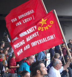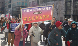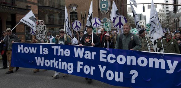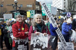 [TOP] Call to Action for April 9, 2011 THEY are the government, corporate, and financial powers that wage war, ravage the environment and the economy and trample on our democratic rights and liberties. WHO ARE THE PEACEMAKERS? WE are the vast majority of humanity who want peace, a healthy planet and a society that prioritizes human needs, democracy and civil liberties for all. The Warmakers spend trillions of dollars yearly on endless wars in pursuit of global domination and profit while murdering millions of innocent people, installing corrupt and hated governments and funding occupations that displace millions from their homelands – trampling on the right of oppressed people to self-determination. THEY send our youth – victims of the economic draft – to fight over the very fossil fuels whose unrestrained use threatens the future of the planet while corrupt and virtually unregulated oil giants dump billions of gallons of death into our rivers and oceans. THEY wage a fake “war on terrorism” at home – the new McCarthyism – that promotes racism and Islamophobia aimed at destroying civil liberties and democratic rights. THEY grant repeated and untold trillions in bailouts to banks, corporations and financial institutions while breaking unions, robbing pensions, destroying jobs, foreclosing homes, de-funding education and vital social services and are once again threatening Social Security and Medicare. THEY offer no solutions to the current crises other than more of the same. THE PEACEMAKERS DEMAND a better world. Only a massive, united, inclusive and independent movement has the power to bring it into being.