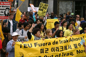 All U.S. Troops Home Now! Voice of Revolution salutes all those demonstrating and mobilizing against U.S. aggression. The issue at stake is U.S. violence and use of force against the peoples. Holding firm to this orientation of targeting U.S. aggression and wars as the source of problems, organizations and activists are meeting the government effort to divert and divide the anti-war movement by trying to make Libyan leader Qaddafi the issue. Troops Home Now is the resounding call and the humanitarian act of Americans. As Americans, we defend the rights of all by demanding an end to U.S. aggression and interference and rejecting use of force in the settling of conflicts among nations. We urge everyone to continue to build resistance by stepping up the fight against U.S. wars and for the rights of all in April 9 anti-war actions in D.C. and San Francisco and May Day actions across the country. U.S. double standards when it comes to taking a principled stand on the issue of state violence against civilians have also been sharply revealed. The people in Yemen saw 52 unarmed protesters massacred by government, yet the U.S. calls only for “restraint,” and does not denounce it. The same can be said about Bahrain and other countries across the Middle East and North Africa. Most obvious is the continued U.S-backed siege of Gaza, a crime of genocide condemned worldwide, including by the UN, but which continues based on U.S. funding and protection of fellow war criminal Israel. As part of opposing state violence against civilians, we demand an end to all funding for U.S. wars, aggression, and interference of all kinds, including the billions for Israel. [TOP] Protests Across the U.S. Mark Eighth Anniversary of Invasion of Iraq