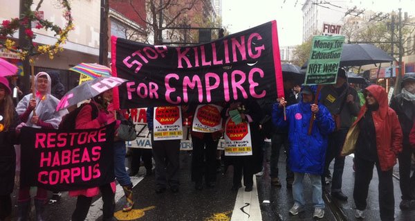 WE DEMAND Bring U.S. Troops, Mercenaries and War Contractors Home Now: Iraq, Afghanistan and Pakistan! End the sanctions and stop the threats of war against the people of Iran, North Korea and Yemen. No to war and plunder of the people of Latin America, the Caribbean, Africa! End U.S. Aid to Israel! End U.S. Support to the Israeli Occupation of Palestine and the Siege of Gaza! WE DEMAND trillions for jobs, education, social services, an end to all foreclosures, quality single-payer healthcare for all, a massive conversion to sustainable and planet-saving energy systems and public transportation and reparations to the victims of U.S. terror at home and abroad. WE DEMAND an end to FBI raids on antiwar, social justice, and international solidarity activists, an end to the racist persecution and prosecutions that ravage Muslim communities, an end to police terror in Black, Latino and Native American communities, full rights and legality for immigrants and an end to all efforts to repress and punish Wikileaks and its contributors and founders. WE DEMAND the immediate end to torture, rendition, secret trials, drone bombings and death squads. We Are Dedicated to a World of Peace and Justice. All Out April 9, 2011