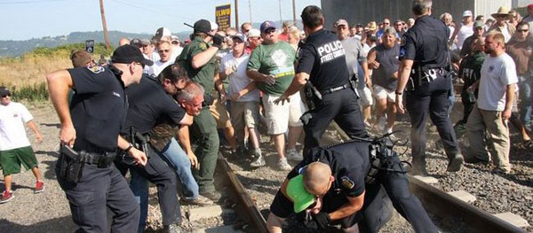 Hundreds of longshoremen and their supporters block a train carrying grain to a loading facility staffed by scab labor in Longview, Washington, September 7, 2011. Police in riot gear charged the group, which included women and children, injuring several in the process, but the people stood their ground. (ILWU) Longshore workers in the Pacific Northwest say that they are determined to bring the entire Longview Port, including the new grain terminal within their union family and under a similar collective agreement. The conditions of today, where monopolies act with impunity under the protection of an anti-social aggressive state machine, demand the opening of new ground in defense of workers’ rights just as the situation in 1934 called for heroic actions to open new ground to establish the ILWU. Longshore and other transportation workers along the west coast of North America add value to the commodities they handle. Those workers have first priority on the added-value they create; governments have second claim, while the claims of owners of capital come last. That is the progressive trend of history and the only way a modern society can operate. Governments and companies must be held to account to abide by that modern definition of the distribution of added-value. To turn a modern society upside down and have a monopoly deny the rights of the actual producers and the progressive trend of history and declare its claim on the added-value workers produce as the first priority and for government authorities to support that obsolete position using the power of the state machine to criminalize workers will not work and can never work. (Voice of Revolution, October 17, 2011)