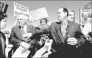 North Korean workers and youth greet delegates from the south. As female representatives of the three sides entered the stadium carrying a huge Korean Peninsula flag, the flag of the festival, and hoisted it amid the playing of the “Song of Great National Unity,” balloons soared into the sky over the stadium and pigeons flew high and fireworks were displayed, beautifully decorating the night sky over the city. When An Kyong Ho, chairman of the north side’s preparatory committee for joint functions of Koreans in the north, the south and overseas to implement the June 15 joint declaration, declared the festival open, a huge balloon from which was suspended a streamer reading “Grand June 15 Festival for Reunification” soared into the sky from the center of the field of the stadium amid the sound of a bell heralding the opening of the festival. Paek Rak Chong in his speech said that the grand festival for the national reunification is a grand festival of the nation which epitomizes the successes made in the last period in the spirit of the joint declaration. It is an assembly for great national unity that demonstrates to the whole world the nation’s aspiration for peace and its will for reunification. Underscoring the need to let the world know that no obstacle or military threat could stop the Korean people’s advance to achieve peace and reunification, he called for making this year, 60 years since the division of Korea, a year of bringing about a turning phase of peace and reunification. Kim Su Sik, vice-chairman of the overseas side’s preparatory committee, said in his speech: “It is the lesson taught by the last five years since the publication of the joint declaration that without the struggle against the anti-reunification forces, it is impossible to implement the June 15 joint declaration. All the Koreans will surely punish the United States and the anti-reunification forces serving their master with the might of the strong unity under the banner of national independence, peace against war, and for reunification and patriotism.” Yang Hyong Sop in a congratulatory speech said that the grand festival is the biggest-ever national assembly since the division of the country because broad strata of personages and compatriots representing different circles in the north, the south and overseas have gathered to share the will for reunification and patriotism. The Korean nation succeeded in finding its way out at the historic turning point where a new millennium had begun, he said, adding that the June 15 joint declaration warmed the relations between the north and the south which had long been kept away from each other and put the inter-Korean relations characterized by antagonism and confrontation onto the path of reconciliation, cooperation and reunification. He expressed the belief that the festival would achieve shining success and thus bring greater hope to all the fellow countrymen aspiring for national reunification and decorate this significant year as a year of opening a new phase in the movement for independent reunification. Rev. Popjang, honorary representative of the south side’s preparatory committee in his speech said that the spirit of reconciliation enshrined in the joint declaration has served as a cornerstone of confidence and unity. WIthout the June 15 joint declaration, it would have been quite impossible for Koreans in the south, the north and overseas and representatives of the south and north authorities to have such a grand assembly as today. [TOP] People’s Movement Against State Terrorism Protests Demand International Terrorist Posada Carriles Face Justice In demonstrations across the country June 13, people took their stand against state terrorism, demanding that the government extradite Posada Carriles to Venezuela to face justice for his crimes. Posada Carriles is known through out the Americas as one of the most notorious terrorists, trained, organized and funded by the U.S. He has been part of numerous U.S. terrorist crimes including the Bay of Pigs invasion against Cuba, efforts to assassinate Cuba’s Fidel Castro, the torture, kidnappings and killings of Plan Condor in Argentina and many other countries of the Americas. Posada Carriles was convicted in Panama of attempting to assassinate Castro by planning to bomb the UNiversity hall where Castro was to speak. He is known as the main organizer of the bombing of a Cuban airline flight in 1976, killing all 73 people on board. Recently released CIA and FBI documents confirm his role in this terrorist crime. Demonstrators targeted the government’s refusal to arrest Posada Carriles as a terrorist and immediately extradite him to Venezuela, where he is a fugitive from justice. Venezuela has now demanded his extradition three times, and the U.S. government refuses to honor it, breaking its own laws and extradition treaty.