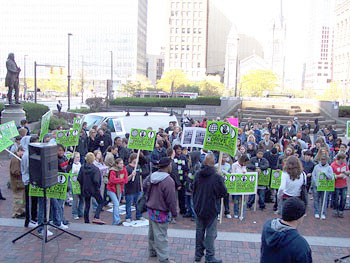 Top: New York City; Middle: Chicago; Bottom: Cleveland On November 2, anniversary of the 2004 election fraud, the “World Can’t Wait, Drive Out the Bush Regime” campaign held actions all across the country. New York, Atlanta, Chicago and Los Angeles saw major actions while many other cities also held spirited rallies and marches. These included Honolulu, Hawai’i, Jackson Hole, Wyoming, Phoenix and Tucson, Arizona, Boulder, Colorado, Tulsa, Oklahoma, Springfield, Missouri, Kalamazoo, Michigan, Eau Claire, Wisconsin, Boone and Ft. Lauderdale, Florida, Chattanooga, Tennessee, Austin, Houston and San Antonio, Texas, and Hampton Virginia. The actions were characterized by the participation of large numbers of high school students, who walked out of class despite numerous efforts to stop them, including school lock downs. Banner drops at rush hour, street theater and drumming also expressed the energy and militant spirit of the protests. Below are reports from some of the actions, compiled based on reports submitted by participants (see www.worldcantwait.org for more reports and information.) Chicago, Illinois An activist reports, “Colombia College 11am: The front lobby of the school had been turned into a sign-making operation – neon green attached to sticks. People gathered, as a bullhorn started listing the crimes and atrocities of this regime. Suddenly a cheer went up as people arrived in a bunch – walking out of several classrooms to join in. Off we went, about 200, loud, for the main Chicago convergence – the buildings echoed with “The World Can’t Wait—Drive out the Bush Regime” and “Join Us!” “Students defined the character of the rally – young, spirited, intense. There were lots of people who had never been to a rally before. Prologue/Winnie Mandela, an alternative high school on the south side, was in the house. Student leaders from Clemente made it just in time, after being locked down for hours. And Oak Park River Forest High School received a shout out when their arrival was announced. Columbia College, Harper College and the University of Illinois at Chicago were all there in force. One political science major from University of Illinois Chicago said he saw the march go across campus and just couldn’t go to class – he had to come along. “Federal Plaza was filled with at least 2,000 people and real energy – despite the attempt by a double row of cops in riot gear to threaten. One man who had been in the marines for four years said he could not sit by any longer, as did a woman whose son is in the Navy and a family with home-schooled kids who said ‘what happens to our sons if the government brings back a draft?’ “The march wound in a great loop through downtown Chicago taking the entire breadth of the streets on a weekday.” Oak Park, Illinois Oak Park, which borders on Chicago, saw a second demonstration after the main downtown Chicago action. As a participant reports, “It was going on 5pm and we were still high off that amazing noon rally in Federal Plaza in Chicago,” which included large numbers of Oak Park High School students. Back in Oak Park demonstrators decided to keep going and organized to do so. The report continues: “A student leapt atop the 15 foot obelisk at the entrance of Scoville Park and planted the huge globe flag and World Cant Wait sign there for all to see. Other students gathered on foot and bike below, some of them telling us of being met at the door of the high school that morning by security guards who ordered them back to class. ‘You should have been more determined and gone to another door!’ we retorted. ‘We did and there were more guards there!’ they insisted. “Students, passersby and homeless who half-live in the Park joined with organizers to post “Drive Out the Bush Regime” lawn signs along the perimeter of the park. Like the trail of crumbs Hanzel and Gretel left to show the way, the signs with the torture victim emblazoned on them led people right into the stage area. A sublime Miles Davis trumpet wafted out onto the streets of this very anti-Bush suburb, inviting more people in. And in they came! “Some had taken part in the tremendous step forward that day at Federal Plaza or had their sights lifted upon hearing the news minutes before about the mass actions nationwide. We grew to 125 people at different times, as the speakers from the area stepped up on stage and began to speak under the lights and canopy reading, “No Lies, No War, No Bush!” Cleveland, Ohio “Cleveland rocked it out today! We began the day with banner drops over major freeways and roadways. 80 students, in two waves, walked out of Shaker High. About 15 broke out, then went back and called everybody else to join us and they did. Black and white, joining the main rally, and calling out to people downtown to join, and build it. 10 students came from Valley Forge in Parma. They got out before 10am —- then the cops circled the school and kept others trapped — or arrested them — we’re still finding out. 20 to 30 walked out of Cleveland State. Other schools represented were Ashtabula, Cleveland Heights High, Normandy High, Parma High, West Geauga High, Sheffield, Rhodes (Cleveland), Brush. The youth were fantastic — strong, determined, proud. Lots of them got on the open mic expressing all their reasons, dreams for a better world and determination to Drive Out the Bush Regime.” “We got positive feedback from passersby, many who joined us, including a woman commuting who went off about the Bush regime and the need to drive them out. Students really took charge and were unleashed when we took the streets. We had an un-permitted march and at a main intersection we all lied down in the street. People walking by commented ‘good work.’ One woman told me how wonderful it was to see people of all nationalities together forging ahead into the future together.” Springfield, Missouri A protester writes, 
