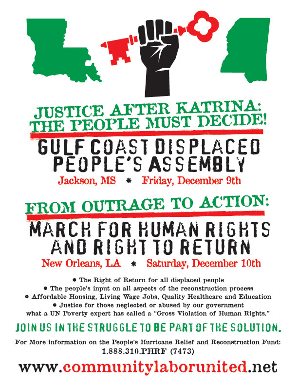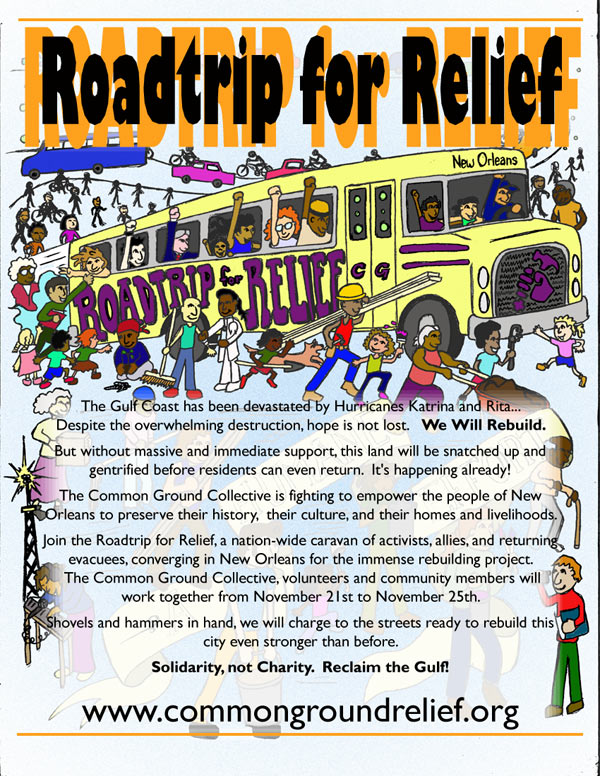 Converge in New Orleans in a Showing of Solidarity! Come lend a hand from November 20-27th. The folks at Common Ground Collective invite you to join an estimated 300 volunteers from around the continent converging in New Orleans the week of Thanksgiving. We want to encourage those in attendance to arrive with building and cleaning supplies, donated equipment and, if possible, funds that we can apply directly to help rebuild and the 9th Ward. All volunteers coming in for the Road Trip For Relief are asked to go to the Convergence Space at 2831 Marias Street first! We are calling for Solidarity, not Charity! Upon arrival, we will orient you to the long history of neglect and oppression in this area and offer tips on how to connect with the community in a respectful and effective manor. Then we will plug people into community projects in the 9th ward where we have just opened a new distribution center and where we are helping to coordinate efforts to challenge unjust city, state and national governments' policies and commercial exploits. Common Ground Collective will supply basic shelter and food, as well as evening events throughout the week. Each day we will divide into working teams and focus on clean up and rebuilding projects. Each evening we will show films, provide entertainment and opportunities, at several locations around the city, for you all to debrief your daily experiences. We will also offer a huge Thank You Feast on Thanksgiving Day, with great surprise performances from guest musicians and artists. We are asking all participants to: Come prepared. We are expecting around 300 people and will need your skills of self-organizing to orchestrate our powerful and effective week of work here! Please check in here (www.commongroundrelief.org) for an online registration form. We would love to confirm that you are coming, so we can better prepare for your arrival. Below are both a sample checklist for your own supplies, and a bigger list of the donations we need to make this project a great success. We also need help with specific skills: electricians, mechanics, plumbers, mold abaters, roofers, construction workers, carpenters, tree workers, lawyers, cooks -- and people who can train other volunteers and residents in these skills. Write commongroundvolunteers@gmail.com with questions or to make special arrangements. For questions relating to donations, please write cgcdistribution@gmail.com. Call 504-339-5885 to contact Kerul Dyer, Roadtrip for Relief Coordinator. Thanks for all of your support. What to Pack: Bring a sleeping bag, a pad, flashlight, work clothes, closed-toed shoes, hand sanitizer, toiletries, specialty needs, and insect repellent. If you can, bring a N95 or higher respirator, tyvek suit, work gloves, rubber boots, a box of 3 mm. contractor plastic bags and a camera. If you cannot afford protective gear, it will be provided for you. We are asking folks to arrive in New Orleans on November 20th and work through the Thanksgiving week until November 27th. Of course, volunteers are needed continuously and can arrive anytime. If you cannot get down here, you can still help! You can organize vehicles, Donate $$$$, or supplies (see the list below). Help raise funds, plan a fundraiser, ask your network to donate. Help spread the word. Monetary donations. Please write and send tax-deductible checks to Common Ground’s fiscal sponsor: Community Futures/ Common Ground Collective, 221 Idora Ave., Vallejo, CA 94591, (707) 644-6575 Supplies: needs list: (please donate supplies in good condition that are ready to use, see www.commongroundrelief.org for complete list): Tarps (for roofing, 30x 20/50) Electrical supplies for rewiring houses (wire, outlets, breakers, etc.) 12 Amp, 100-foot extension cords Sheetrock Good quality tools Hammers and nails Sledgehammers Drills and thick screws Tents (12x 20/30), Domes Computers ready to run Generators (we prefer diesel, so we can run biodiesel) Trucks/Tractors (also prefer diesel) Mobile Kitchens Liquid vacs (wet/dry vacs) and pressure washers Chainsaws Respirators N95 facemasks Shovels Brooms Mops Rakes Contractor trash bags Batteries Dollies To send supplies directly to Common Ground, please mail to: Common Ground Relief Center 331 Atlantic Ave New Orleans, LA 70114 Medical: To support Common Ground’s Free Medical Clinics, please refer to: www.commongroundrelief.org/2005/09/info_for_volunteers_at_common.html#more [TOP] Small Victories Bringing Hope Back to New Orleans When Bertha Dugas went to the FEMA center set up at the shopping center near her home in Terrytown, she did not expect much. FEMA had never given her the promised relief money, or any help at all. But this time, she was in tears, about to get kicked out of her apartment, and came to the desk worker with no hope in her heart, but with nowhere left to turn. The FEMA worker, a 'volunteer' from Massachusetts getting paid $700 a week by FEMA, did not know how to help, what to do. FEMA had given her no instructions or provisions for how to help people who were losing their homes due to post-hurricane evictions. But she remembered hearing about the grassroots work of Common Ground and gave Ms. Dugas our number. Within a day, Common Ground's anti-eviction team was on the scene at Ms. Dugas' apartment complex [Louisburg Square] beginning a campaign that would stretch over a week, involve dozens of people in several cities, national media, and lawyers, and which would eventually result in a tenant victory in court. Malik Rahim, who helped found the Common Ground collective 2 months ago said that their humble group has "provided material aid to over 16,000 people, including food, clothing, supplies, assistance in finding shelter and job training. The Common Ground Health Clinic has also provided free healthcare to over 36,000 patients since Katrina. The government has not given us support for this work on any level, they prefer to organize a culture of violence where police can shoo